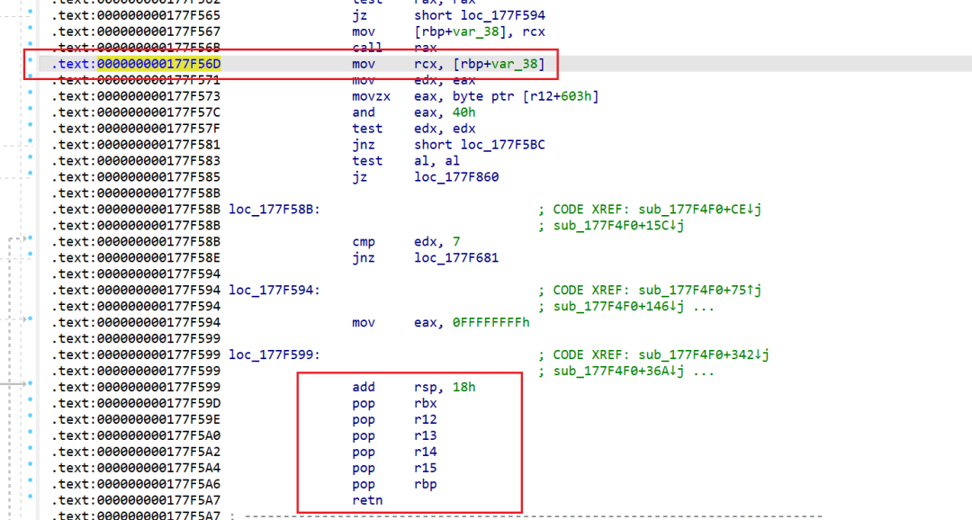 通过调试,可以发现程序执行到代码位置的0x176bc97处,正常会向上一级回溯到函数sub_177F4F0中地址0x177f56d处执行