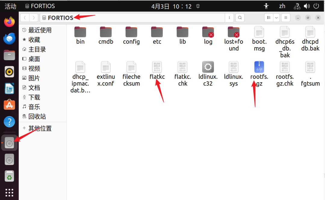 接着要提取FortiGate固件。首先将上面的FortiGate虚拟机挂起,然后将FortiGate虚拟磁盘挂载到我们的pwn虚拟机中。重启后,能看到成功挂载的磁盘FORTIOS,里面有我们想要的固件flatkc(内核)和rootfs.gz(文件系统),拷贝一份至桌面即可