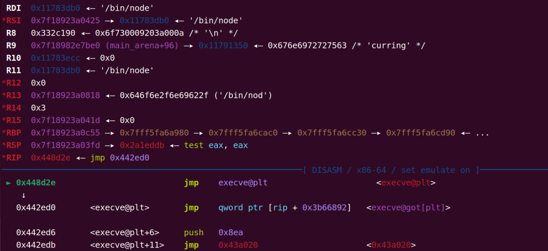 最后将所有的寄存器都赋值,并且调用execve函数,并且成功加载了/bin/node: