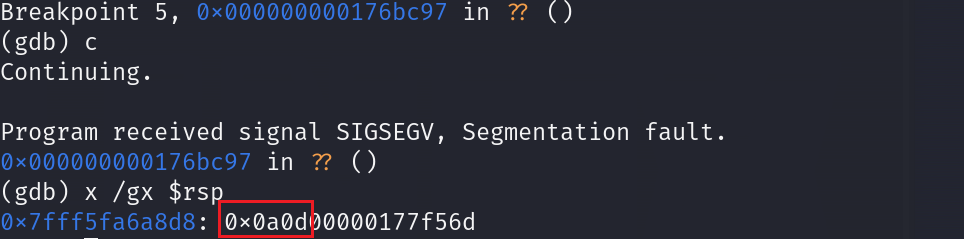 所以,假设向chunk length字段发送大量0的长度远超剩余缓冲区长度的1/2时,就会触发越界写入0x0a0d。调试后发现栈上偏移0x2028的位置保存了返回地址。如果在偏移0x202e的位置写入0x0a0d,当函数返回执行ret指令恢复rip时就会因地址非法产生崩溃。