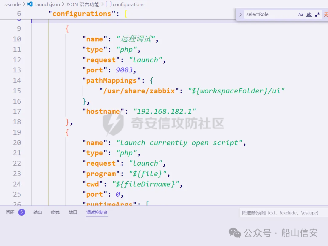 { "name": "远程调试","type": "php","request": "launch","port": 9003,"pathMappings": { "/usr/share/zabbix": "${workspaceFolder}/ui" },"hostname": "192.168.182.1"}