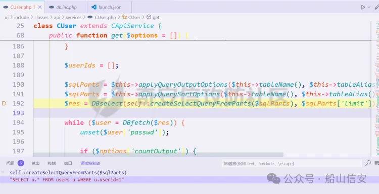 定位漏洞点ui/include/classes/api/services/CUser.php#get