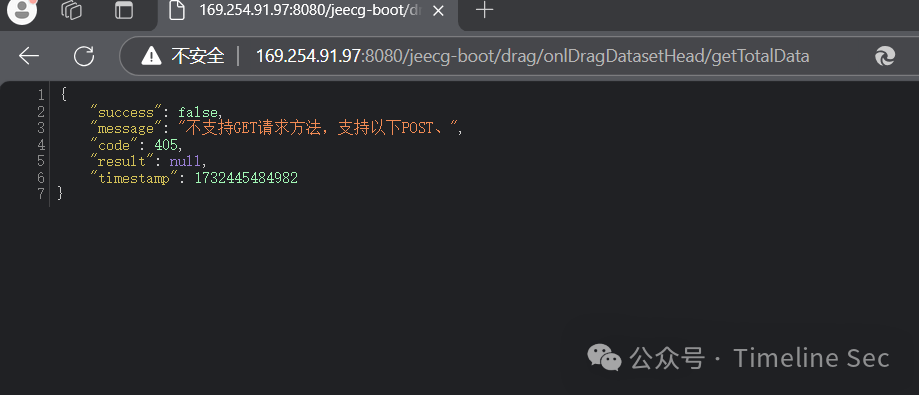 访问http://IP:8080/jeecg-boot/drag/onlDragDatasetHead/getTotalData可以发现服务可用,不能以get方式访问
