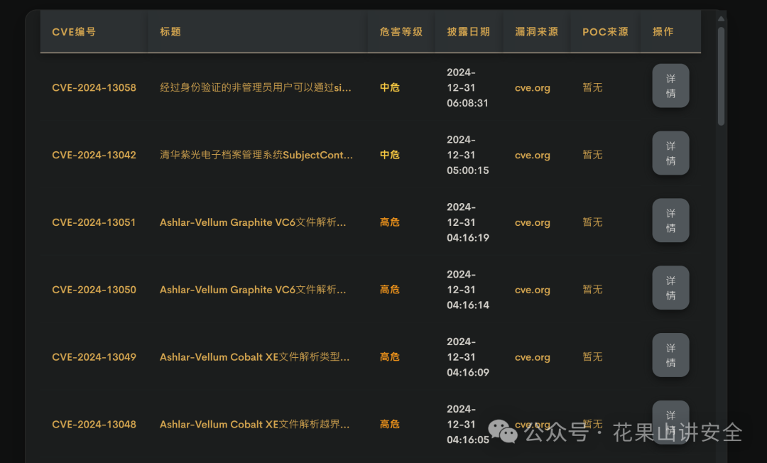 CVE漏洞监控 发布于2024年12月31日2025年7月19日 作者:cve-20 CVE漏洞监控 原创 猴子 花果山讲安全 2024-12-31 02:17 小编不才,联合中龙技术的其他大佬一起写了个CVE漏洞监控平台,如有建议,欢迎反馈。 点击阅读原文可跳转至cve漏洞监控平台