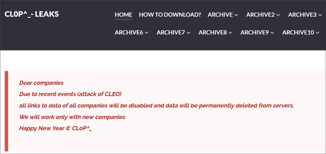 CL0P^_-LEAKS 勒索网站上的消息,来源:BleepingComputer