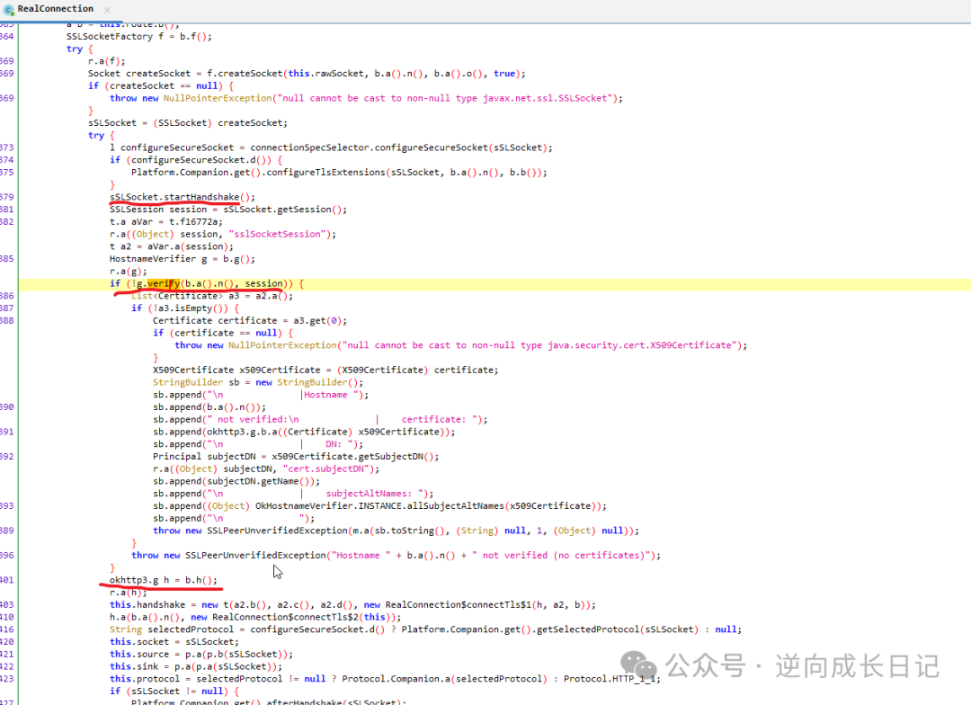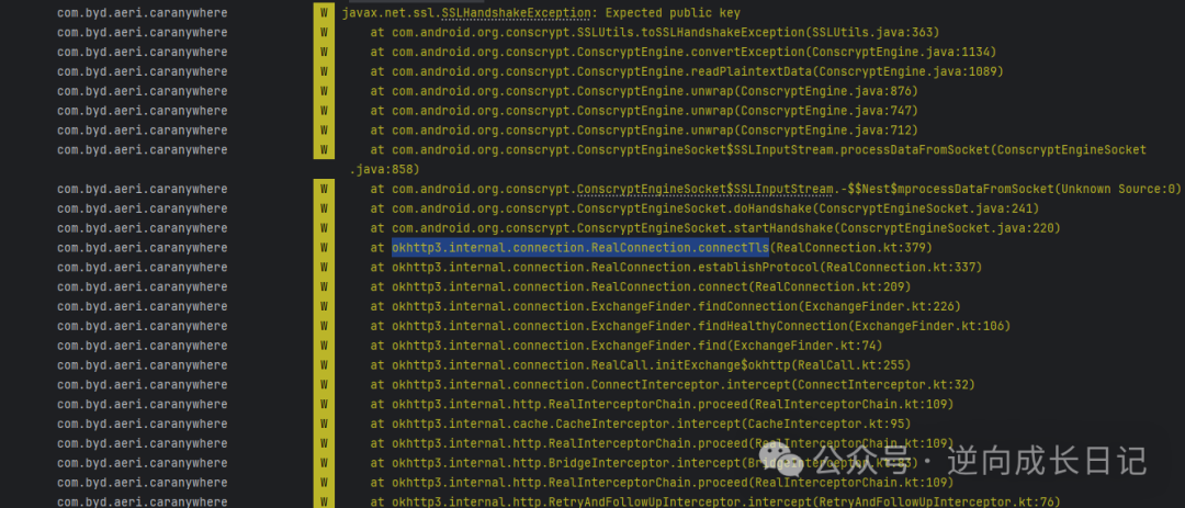 SSLHandshakeException,堆栈前面是系统库,那关键部分就在okhttp3.internal.connection.RealConnection.connectTls 了