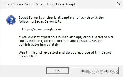 因此,如果攻击者能够使用上述 punycode 绕过技术构建 URL,则用户将不会看到“Secret Server 正在尝试启动以下 URL”的警告。