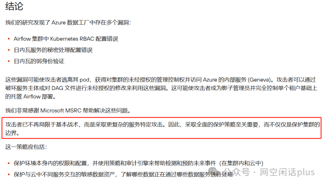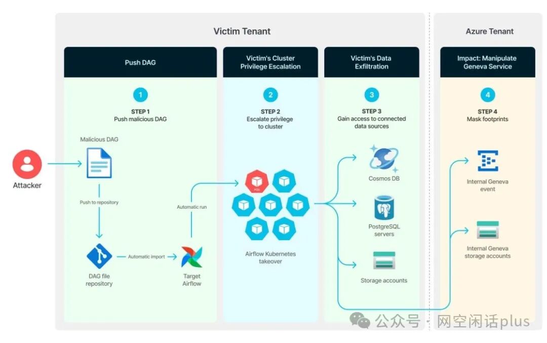 具体来说,数据工厂中发现的缺陷包括:Airflow集群中Kubernetes基于角色的访问控制(RBAC)配置错误;负责管理关键日志和指标的Azure内部Geneva服务的秘密处理配置错误;以及Geneva的身份验证薄弱。