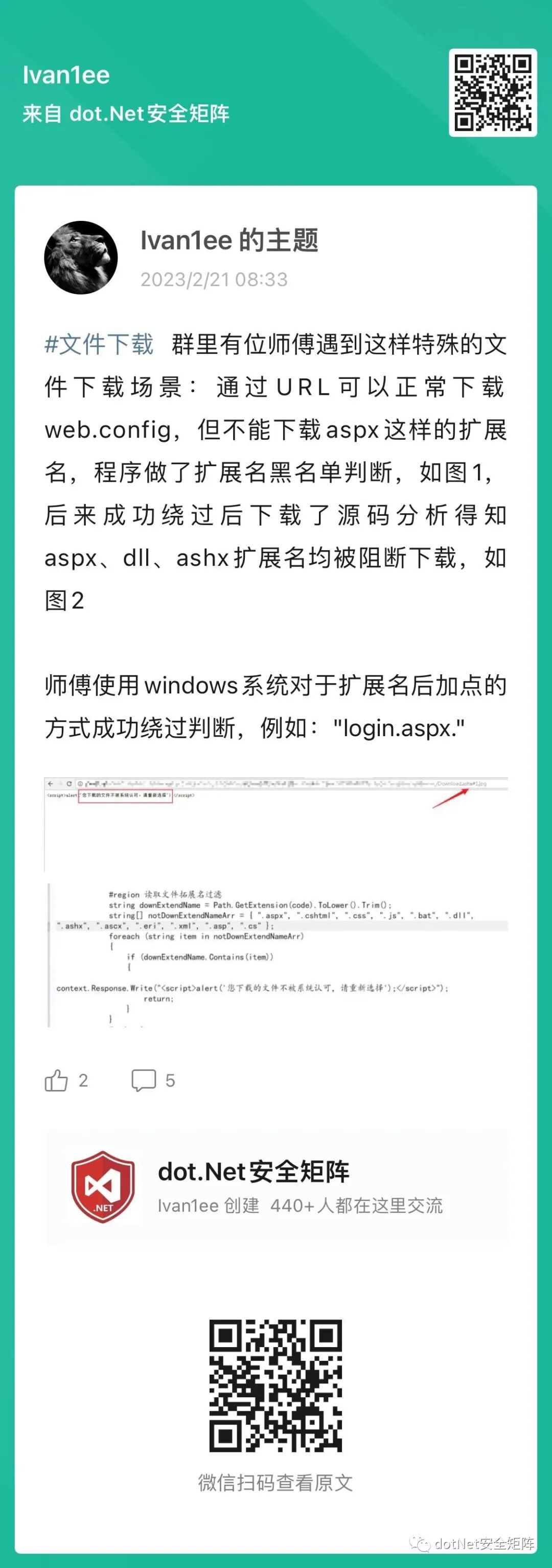 .NET 任意文件下载漏洞绕过 发布于2023年2月22日2025年7月19日 作者:cve-20 .NET 任意文件下载漏洞绕过 专攻.NET安全的 dotNet安全矩阵 2023-02-22 09:25