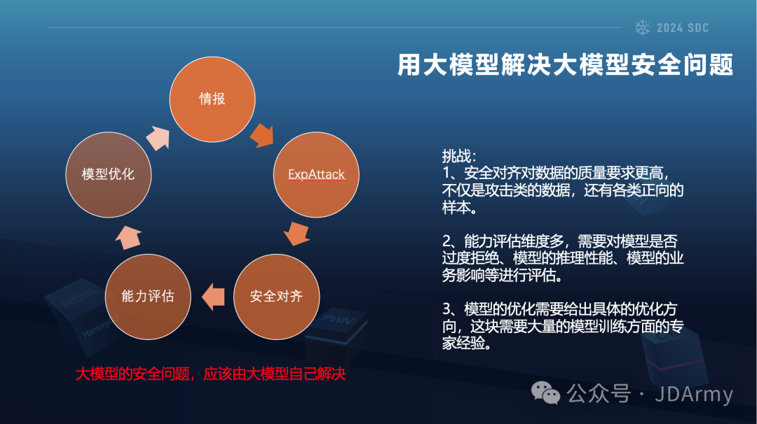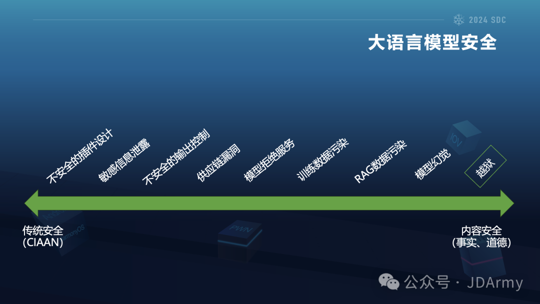 从外部看目前在外部环境中攻击方法是不断在变化的,因为大家看论文也可以看到,从去年到今年,发了很多的越狱相关的论文。另外就是内容安全问题了,每天发生的热点事件都有可能被有心人变成内容安全的问题。