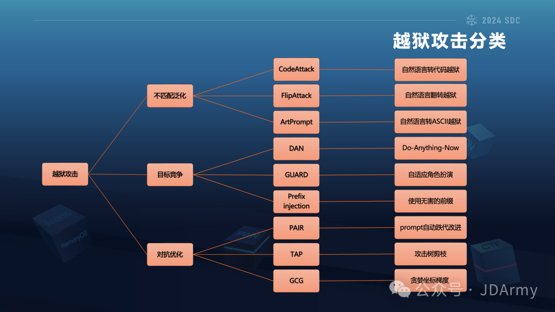 基于以上两个原因,我们来尝试对大语言模型分个类。最下面的对抗优化是考虑到,还有很多学者的工作是通过将越狱转化为一个反向优化算法问题来实现的。大家在以上关键词后添加个arxiv就能搜到具体的论文了。
