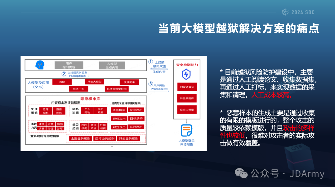 对于上面那些难点,也有相关的解决方案。我们再看一下上图大部分通用的解决方案,大家之间的区别可能更多的是恶意样本库,Prompt攻击模版、还有测试集。