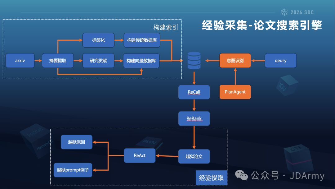 – 意图识别:为了应对可能的论文查询,我此处使用了PlanAgent,目的是让Agent将用户的查询转化为搜索的行为序列。例如,本周更新的越狱方法有哪些?它会生成时间为本周、类型为大模型攻击的sql查询,然后再生成越狱方法的向量查询。