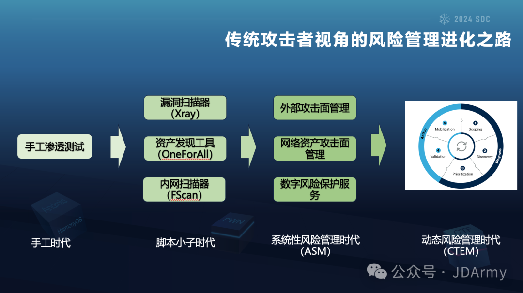 面对这么复杂情况,我们传统安全是怎么解决呢?我们可以通过上图看见传统安全的建设流程,从最开始的时候都是一个漏洞一个漏洞进行手工测试,很快大家可能就会意识到,我们是不是可以开发一个工具对这些漏洞进行自动化扫描、利用,就像Xray、Fscan等。再后来将这些攻击工具进行系统性的分类组合,就实现了攻击面管理。再后来,发现整个攻击面管理主要是在识别攻击面上,没有实现安全风险的闭环。接着就提出了持续威胁暴露管理来动态、持续性的闭环管理安全风险。