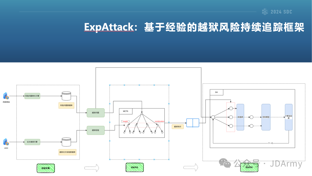 ExpAttack:大语言模型越狱风险持续追踪框架为京东安全蓝军的研究,总共分为四章。第一章将简要介绍大语言模型的风险,帮助大家全面了解大语言模型的风险概况,并详细阐述大语言模型的越狱风险。第二章将介绍当前大语言模型越狱风险管理的现状,分析现有风险管理中存在的问题,进而提出我们的攻击者视角下的大模型越狱风险管理框架。第三章将分享如何通过大模型自动化实现该框架,并介绍我们实现的名为 ExpAttack 的越狱风险持续追踪框架。最后一章将对整个工作进行总结,并对未来的发展方向进行展望。
