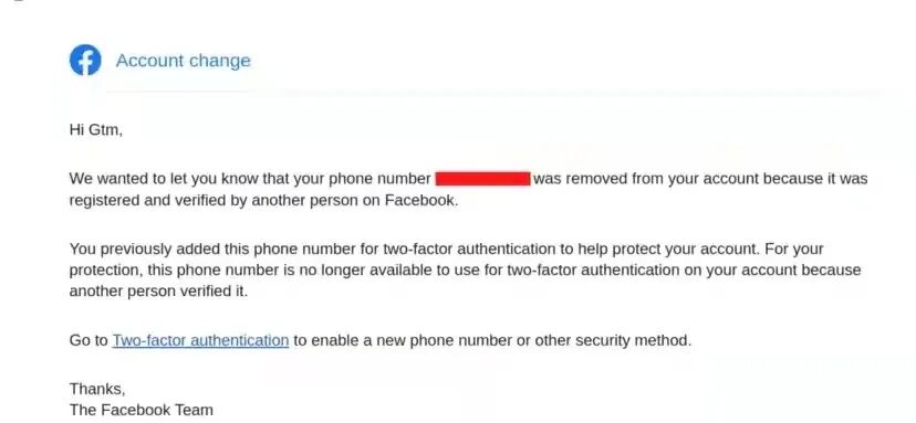 黑客攻击成功后,用户会收到Facebook官方发送的一封电子邮件,通知其电话号码在Facebook上被其他人注册及验证。