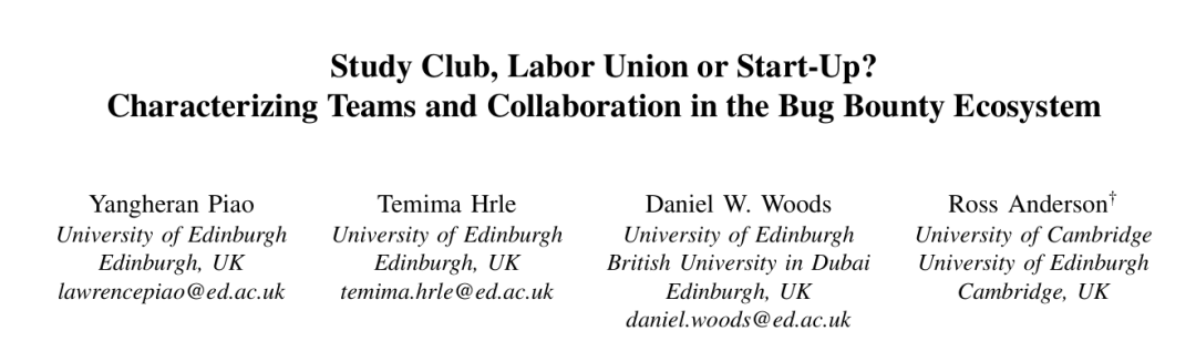 今天介绍的这篇IEEE S&P 2025论文Study Club, Labor Union or Start-Up? Characterizing Teams and Collaboration in the Bug Bounty Ecosystem关注的是我国的安全漏洞挖掘团队的生存状况: