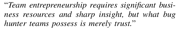 作者在论文的第7.2章还讨论了漏洞挖掘团队是否会持续存在下去(并发展得更好)的理由,首先作者觉得并不是所有团队都会做大做强,有些小而美的团队虽然和SRC去议价能力不强,但是他们有他们内部更好的沟通优势,同时也有可能在某些技术方面有所专长;其次,关于团队是否能够帮助成员成长,这个其实没有什么很好的方法去评估,直觉上虽然会让人以为加入团队就能增长水平,但是也不排除很多人去团队里面就是抱大腿当南郭先生的;还有一个很重要的点是很多团队也会在共产主义和资本主义之间横跳,团队不赚钱也不行,但是大家聚在一起往往也是只想做一个社区而不是想给谁打工。