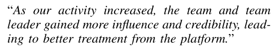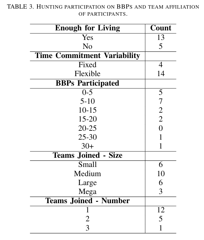 关于作者怎么做调查,估计大家都不太关心,有兴趣的读者可以去读论文原文,我们就挑一些结论来介绍。首先是关于生产力的调研,作者发现,那些以集体方式在各家SRC提交漏洞的团队,平均每个成员的贡献是单兵作战的黑客的两倍。当然你不能根据这个直接得出什么因果性推论,比如黑客组团就能提高水平,也许先是因为水平高了以后,再有什么因素让组团变得更有吸引力?所以作者还进行了更多的深入挖掘,采访了18位相关的黑客: