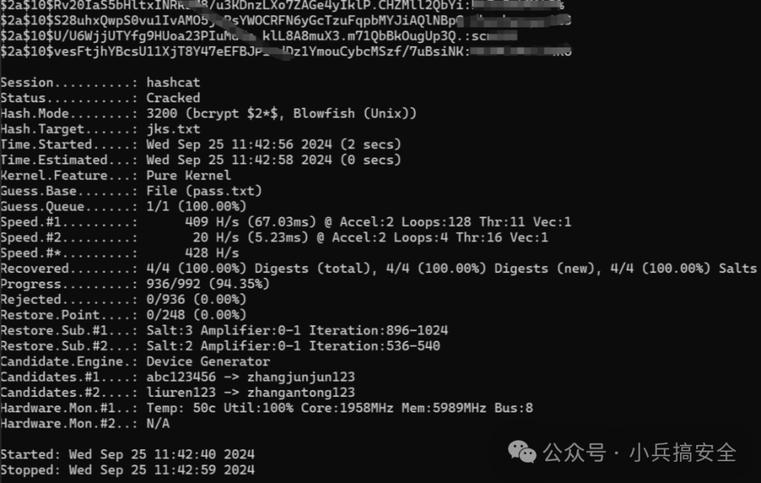 在var/lib/jenkins/users/用户名开头的文件夹中获取某个config.xml的passwordHash值,将其整理成jks.txt,然后在hashcat中执行命令进行破解,如图1所示。