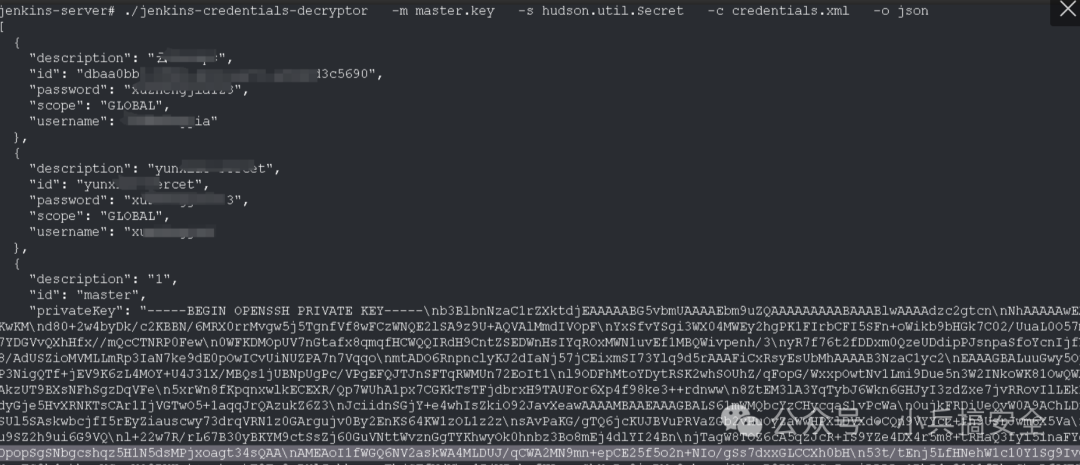 ./jenkins-credentials-decryptor -m master.key -s hudson.util.Secret -c credentials.xml -o json