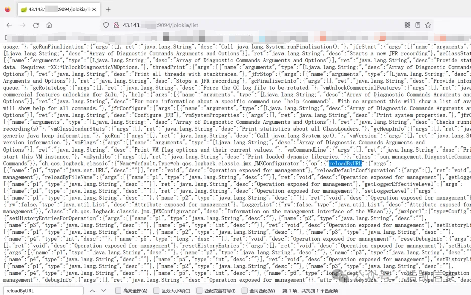 访问/jolokia/list接口,查看是否存在ch.qos.logback.classic.jmx.JMXConfigurator和reloadByURL关键词。