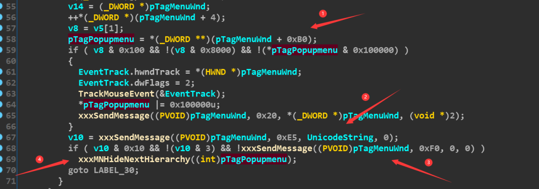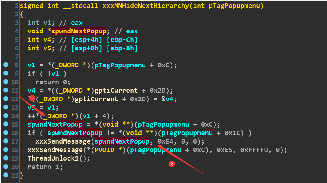在xxxMNHideNextHierarchy函数中,会将pTagPopupMenu偏移0x0C的spwndNextPopup作为第一个参数调用xxxSendMessage函数。
