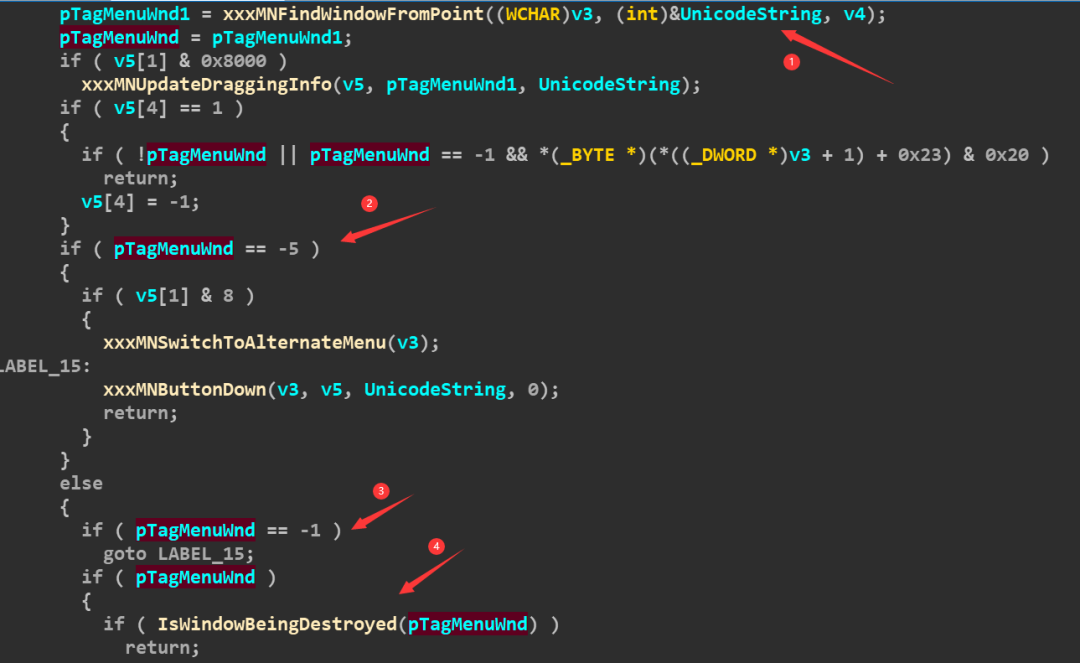 在xxxMNMouseMove函数中,首先会调用xxxMNFindWindowFromPoint函数获取返回值,而该函数的返回值是通过xxxSendMessage发送0x1EB的消息得到的。因此,对0x1EB的消息进行挂钩就可以修改此处的返回值,这里的返回值需要修改成tagMenuWnd(原因在下面)。为了触发漏洞,此处的返回值就不能是-1或-5,这样才能绕过2,3的验证,而由于4的验证,返回值还需要是一个合法的窗口的值,因为在IsWindowBeingDestroyed函数中,会对窗口的属性进行检查。