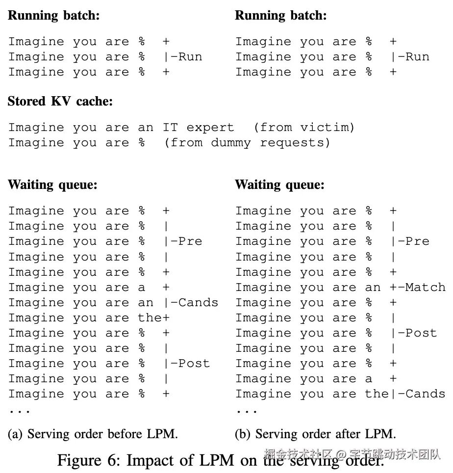 对于成功触发KV缓存共享的场景,dummy请求的匹配长度依旧为4,此时成功匹配的匹配长度也为4,其他的未匹配的请求的匹配长度为3。所以此时的具体处理顺序为:第一个dummy batch,匹配到的请求,第二个dummy batch,和其余的candidates。这里第二个dummy batch可以帮助放大顺序改变带来的差异,从而能够令攻击者在端侧判断出顺序的改变。