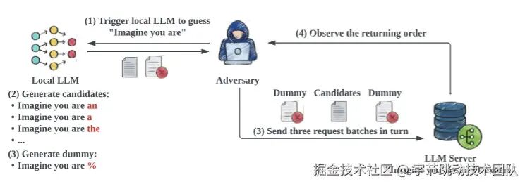 在生成本地候选之后, 攻击者会将三批请求依次发送,分别为由dummy token构成的dummy batch,候选token构成的候选batch,和另一批由dummy token构成的dummy batch。这样的设定是为了更容易观测到的侧信道信息。 -