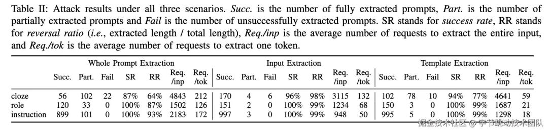 下图展示了攻击的最终效果。结果表明,在Llama2-13B模型上,攻击者在知晓提示模版来回复提示输入上成功率达99%,知晓提示输入恢复提示模板成功率为98%,甚至在无任何背景知识恢复全部请求也有95%的成功率。