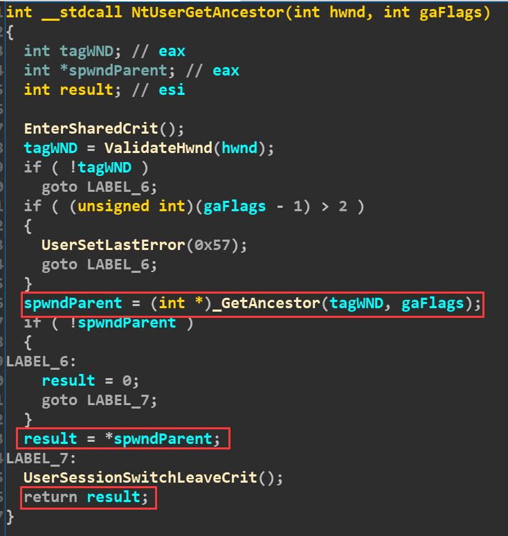 该函数会调用内核中的NtUserGetAncestor,NtUserGetAncestor函数将_GetAncestor函数返回值指向的地址中的值作为返回值: