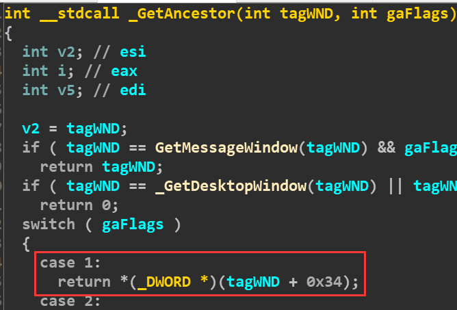 参数gaFlags为1的时候,_GetAncestor函数会返回tagWND中偏移0x34的spwndParent: