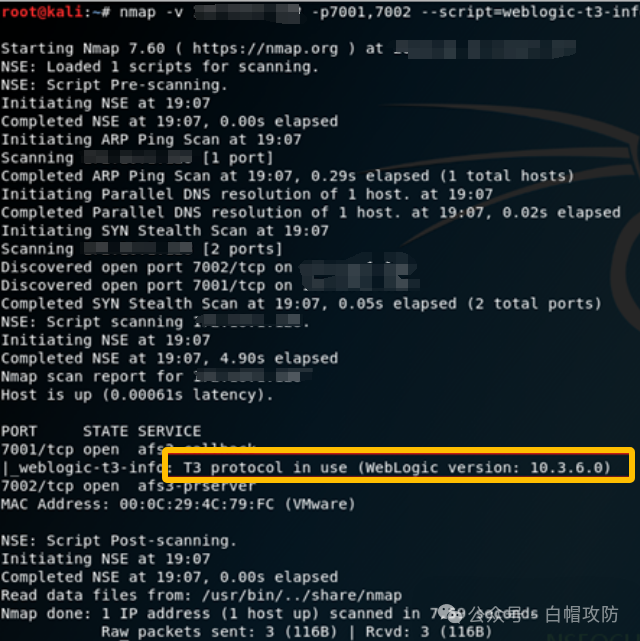 nmap -n -v -Pn –sV [主机或网段地址] -p7001,7002 –script=weblogic-t3-info.nse