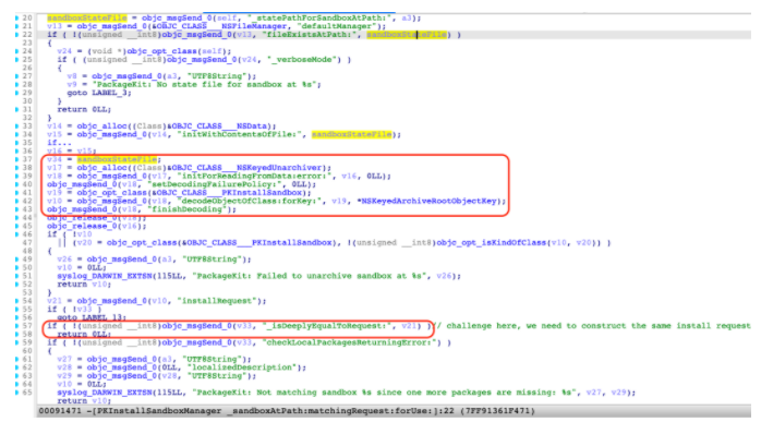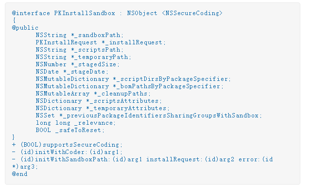 “PKInstallSandbox”实例也可以稍后通过“-[PKInstallSandboxManager_sandboxAtPath:matchingRequest:forUse:]”方法从“SandboxState”文件还原或反序列化: