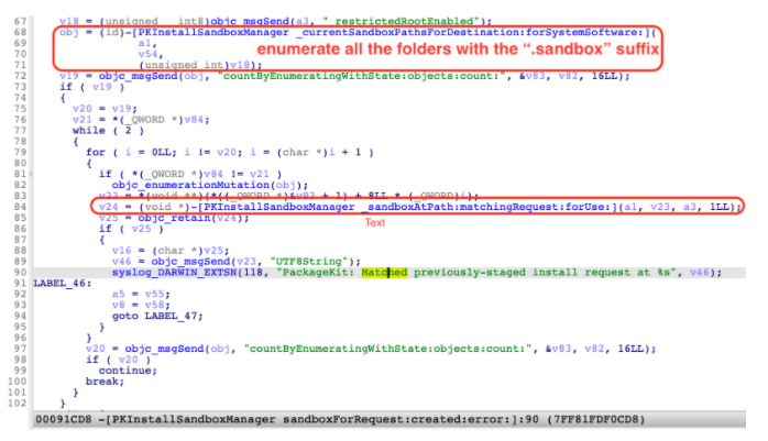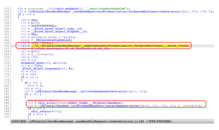 补丁位于“-[PKInstallSandboxManager _sandboxAtPath:matchingRequest:forUse:]”函数中: