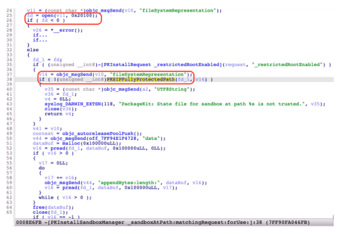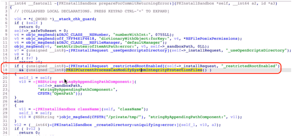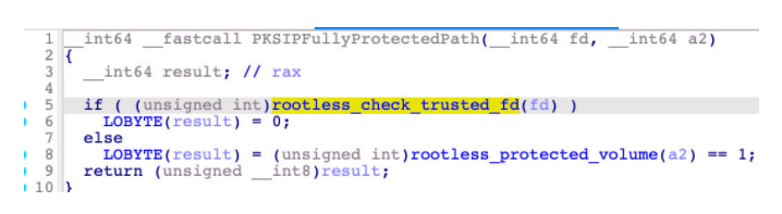 正如我们在第38行检查中看到的,它在内部调用“PKSIPFullyProtectedPath”函数: