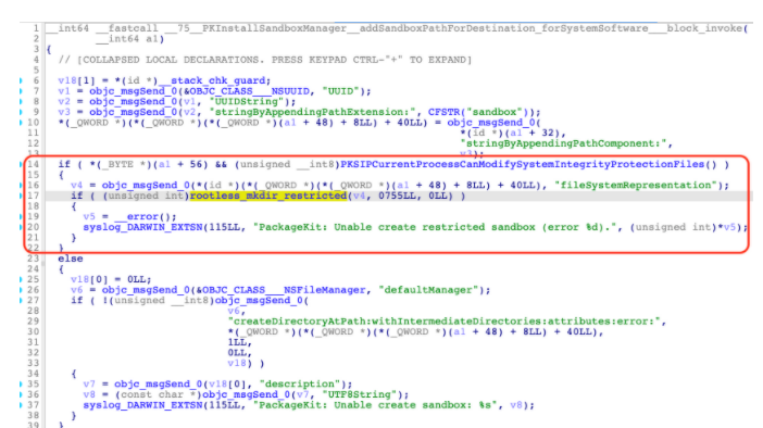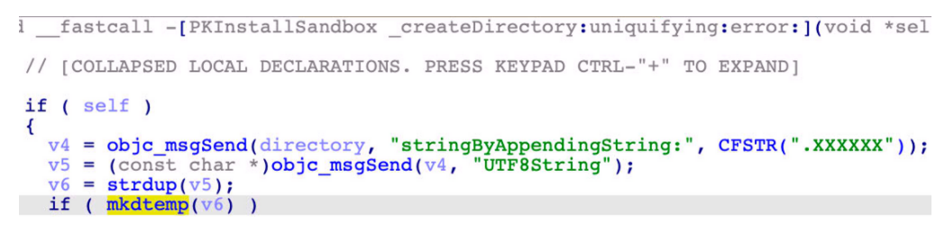 在第16行,它调用另一个函数“-[PKInstallSandbox _createDirectory:uniquifying:error:]”,该函数在内部调用API“mkdtemp”来不受任何限制地创建文件夹。