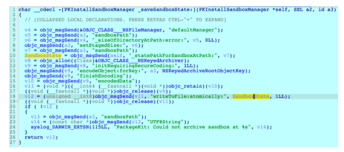 请注意,该实例是可序列化的,并且该类实现了“NSSecureCoding”协议。“system_installd”服务可以通过“-[PKInstallSandboxManager saveSandboxAsStaged:]”方法将实例保存或序列化到沙盒路径中名为“SandboxState”的文件中:
