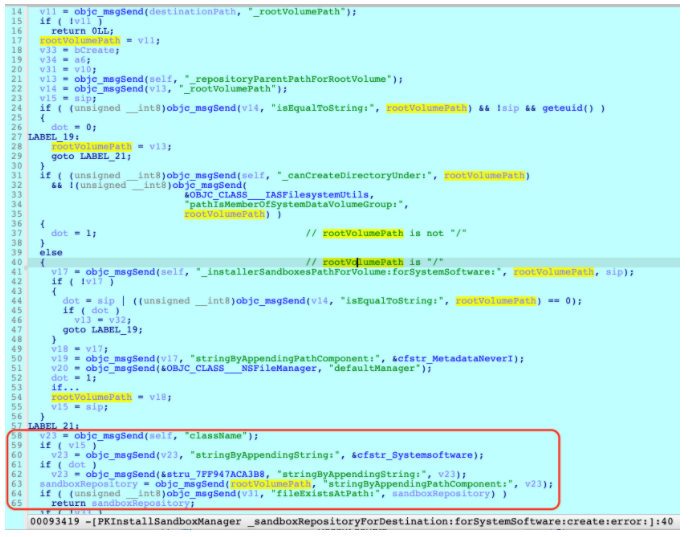首先,让我们看一下“Sandbox Repository”,这是一个由“-[PKInstallSandboxManager _sandboxRepositoryForDestination:forSystemSoftware:create:error:]”函数返回和创建的目录。