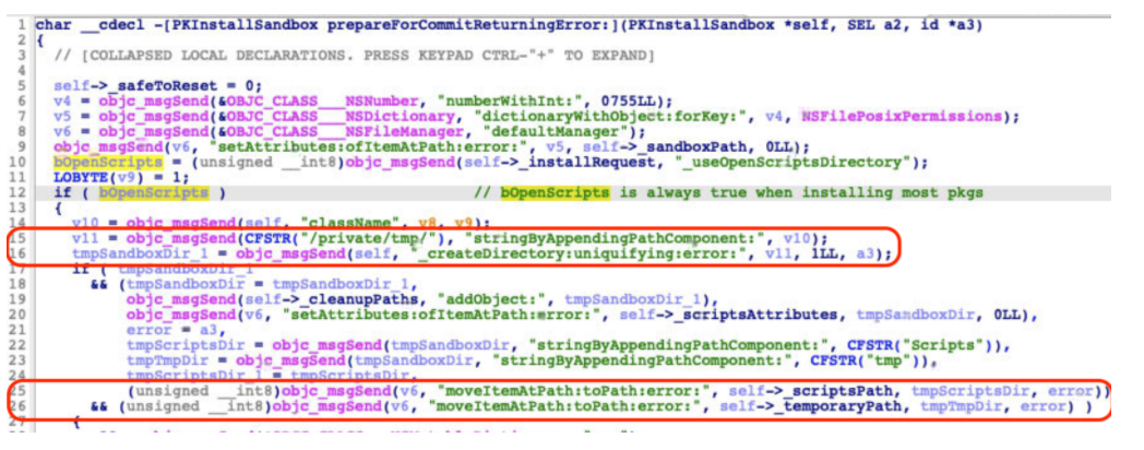 在看到“PKInstallSandbox.XXXXXXX”文件夹未受保护后,我们最初认为它可以被利用和操纵。然而,我们未能直接修改文件夹中的脚本。这是因为子文件夹“Scripts”受到限制,它从受限制的沙盒路径中移动,如上第25行所示。