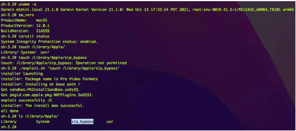 即使我们是root用户,也无法在受限目录“/Library/Apple”中创建文件,因为SIP状态已启用。但是在利用程序的帮助下,我们可以在SIP绕过上下文中执行任意命令,并在受限目录中成功创建文件。