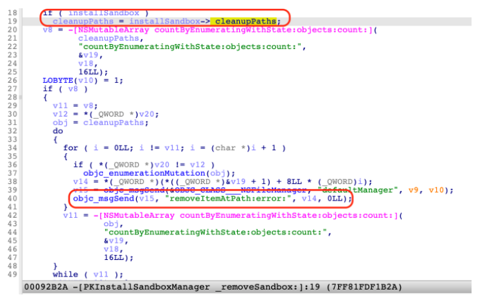 安装完成后,无论是否成功,它都将调用“-[PKInstallSandboxManager_removeSandbox:]”函数删除沙盒,并删除“_cleanupPaths”成员指定的所有文件和文件夹。