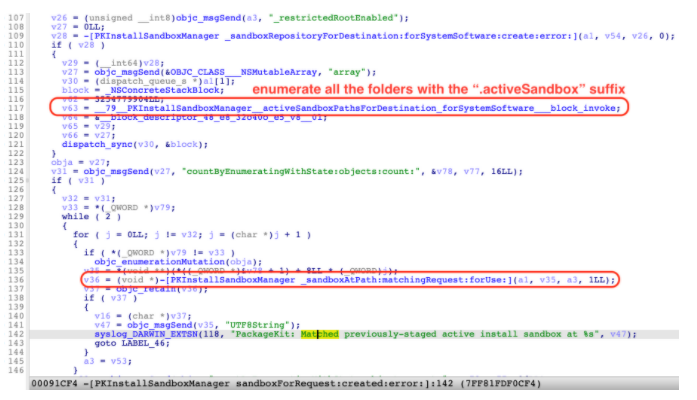 接下来,如果它找不到与安装请求匹配的“PKInstallSandbox”实例,那么它将枚举带有“.activeSandbox”后缀的所有文件夹,并尝试从这些位置还原它们。