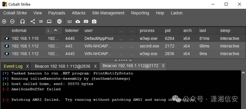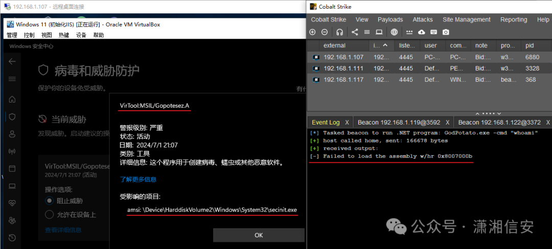 拦截提示为AMSI,这里以GodPotato为例,BadPotato、DCOMPotato等也会被拦,如下图所示。